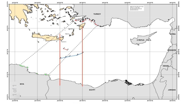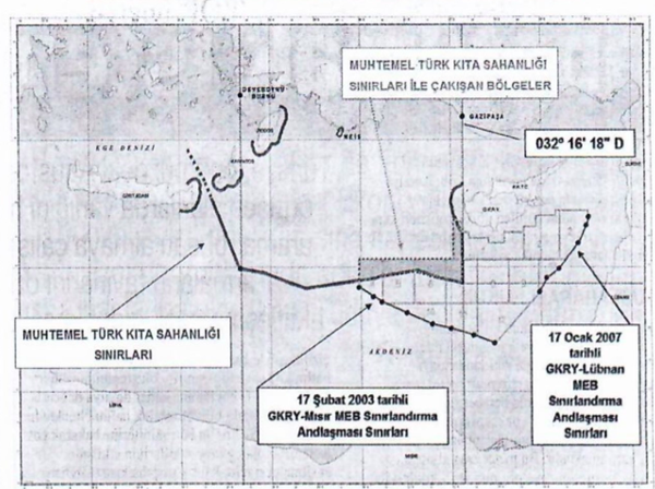 Yukarıdaki haritanın ortaya koyduğu sıkıntı Yunanistan’la sınırlı değildir. Harita aynı zamanda, bu ülkeyle hiçbir temas yapılmamış olmasına karşın Suriye’yle olan deniz alanı sınırını da gösterme iddiasını taşımaktadır.