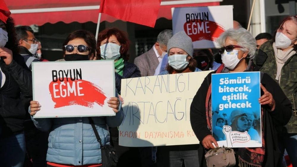 Antalya’da Komünist Kadınlar ve Kadın Cinayetlerini Durduracağız Platformu’nun çağrılarıyla dün Attalos Heykeli önünde toplanan kadınlar, AKP iktidarının İstanbul Sözleşmesi’nden çekilmesini protesto ettiler.