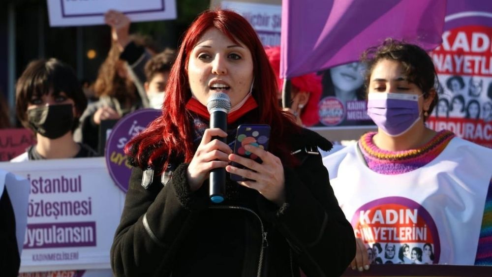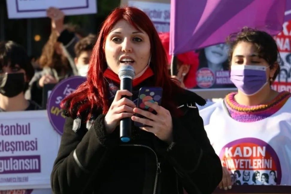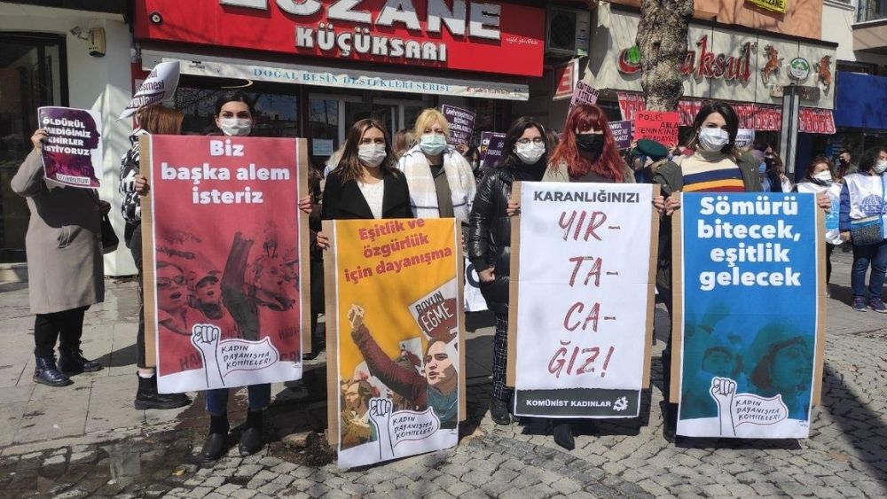 Komünist Kadınlar adına konuşma yapan Ece Demirbağ, "AKP iktidarı, kadınların şiddetle mücadelesinde önemli bir kazanım olan İstanbul Sözleşmesi’nden, ‘aile kurumuna zarar verdiği’, ‘inanca ve kültüre uygun olmadığı’ gibi gerekçelerle bir gecede oldu bittiyle çekildi. Oysa, ülkemizde kadın cinayetlerinin önemli bir bölümü örf ve adetler gerekçe gösterilerek işleniyor. Geçtiğimiz günlerde hapisten çıkıp karısını öldüren kişi de, onu adliyede ‘adamsın’ diyerek destekleyen arkadaşı da, ‘örf ve adet’ adı altındaki gericilikten güç alıyordu. AKP iktidarının korumak adına sözleşmeden çekildiği ‘kutsal aile’de kadının payına düşen şiddet, istismar ve can korkusudur! Biz kadınlar, eşitlik ve özgürlük mücadelemizi engellemek için iktidarın sığındığı ikiyüzlü politikalara kanmıyoruz!’ dedi.