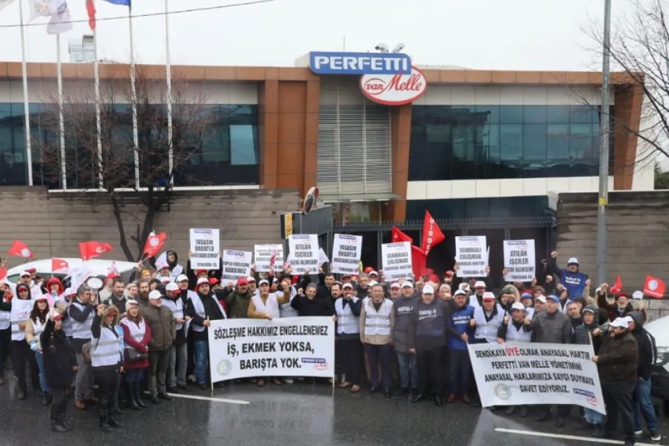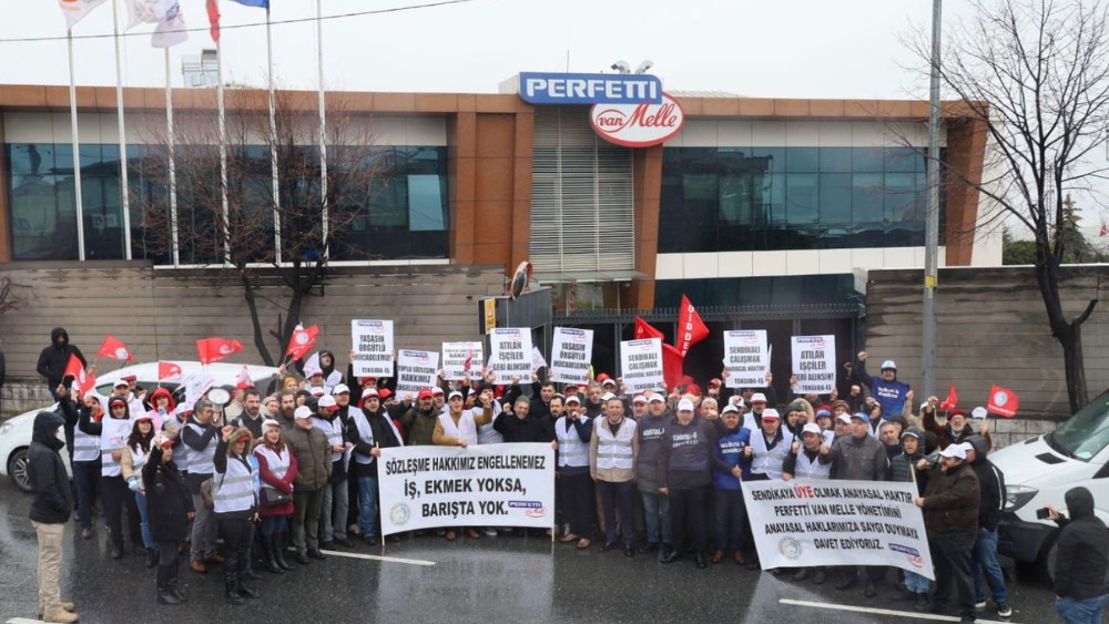 Tekgıda-İş Sendikası, sakız ve şekerleme üreticisi Perfetti Van Melle'nin sendikalaşan işçilere yönelik baskıcı uygulamalarına karşı bugün İstanbul'daki Perfetti Van Melle Genel Merkezi önünde basın açıklaması gerçekleştirdi.