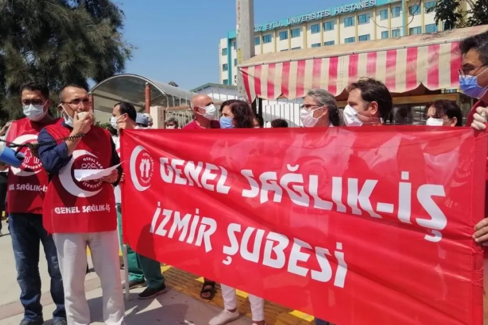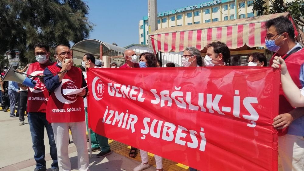 Genel Sağlık-İş İzmir Şube Başkanı Tarık Doğan burada yaptığı açıklamada Dokuz Eylül Üniversitesi Araştırma Uygulama Hastanesi işyeri temsilcisi arkadaşlarının, geçici görevlendirme kisvesi altında, sürgüne tabi tutulmasını protesto etmek için toplandıklarını söyledi.