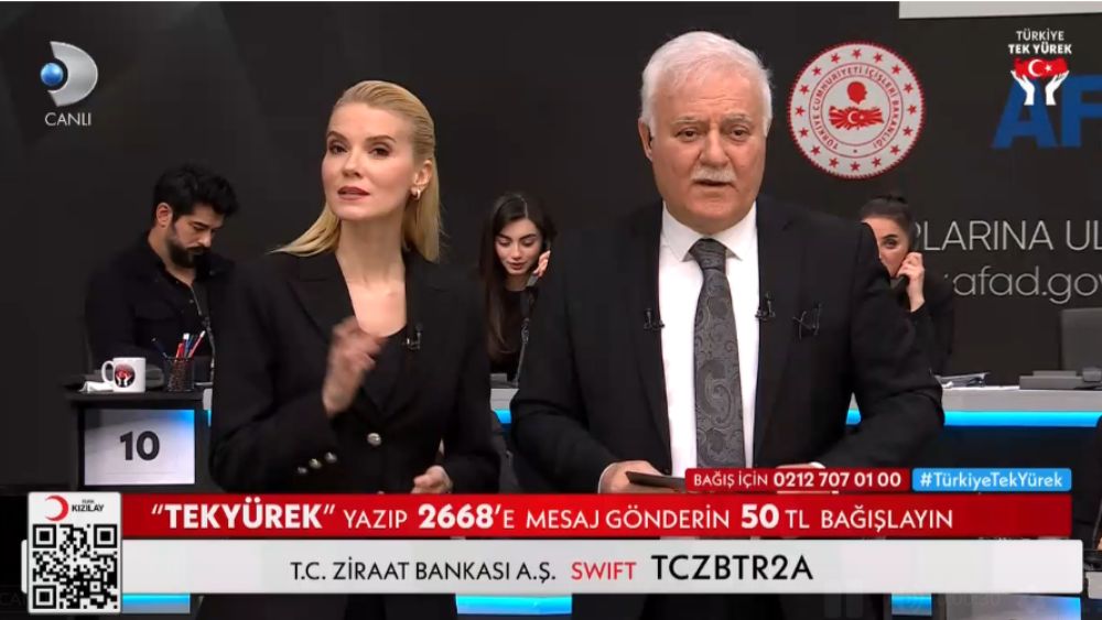 ATV, FOX, Kanal D, Kanal 7, Show TV, Star TV, TRT 1 ve TV8, AFAD ve Kızılay'a yardım toplamak için ortak yayın yapıyor. AKP'li Cumhurbaşkanı Recep Tayyip Erdoğan yayına bağlanarak, "Yurt içinden ve yurt dışından AFAD hesaplarına gelecek her kuruş, depremzedelerimiz için kullanılacaktır" dedi.