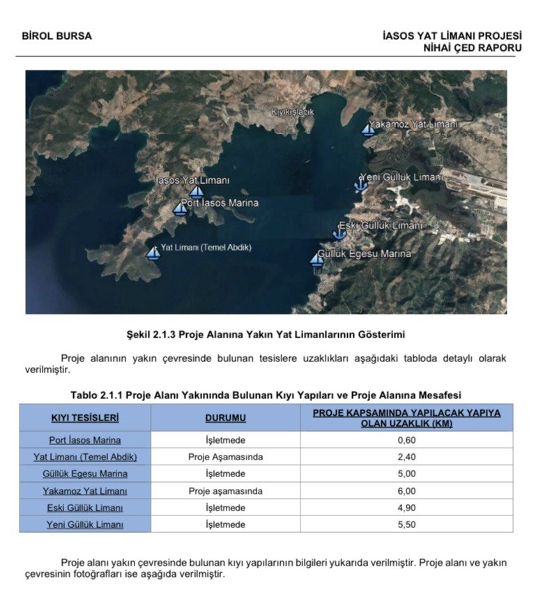 Son yıllarda hızlı bir yapılaşmaya sahne olan Güllük Körfezi’nde, ikisi proje aşamasında olan 4’ü ise işletmede olan 6 adet liman ve yat limanı bulunuyor. Bu projelere eklenen, ‘Kıyıkışlacık Birol Bursa İasos Yat Limanı ve Çekek Yeri Projesi’ için 4 Nisan 2024 tarihinde Çevre, Şehircilik ve İklim Değişikliği Bakanlığı tarafından ‘ÇED Olumlu’ kararı verildi.