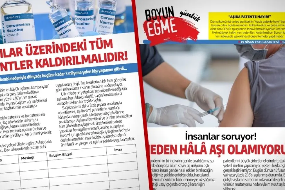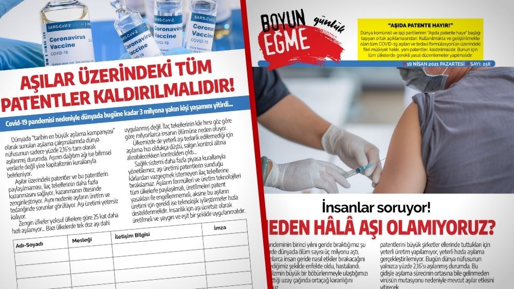 "İnsanlar soruyor! Neden hâlâ aşı olamıyoruz" manşetiyle çıkan gazetede "Aşılar üzerindeki tüm patentler kaldırılmalıdır" imza metni de yer alıyor. TKP'nin önümüzdeki günlerde ülke çapında hız kazandıracağı kampanyanın metni "Bu formla imza toplayabilir, imzaları bulunduğunuz bölgede TKP büroları ile semt evlerine ulaştırabilirsiniz. Yaşadığınız yerellikte büromuz yoksa dijital olarak [email protected]’ye gönderebilirsiniz." notuyla yayınlanmış. İmza föyüne ve kampanyayla ilgili bilgelere TKP sitesindeki bu sayfadan erişebilirsiniz.