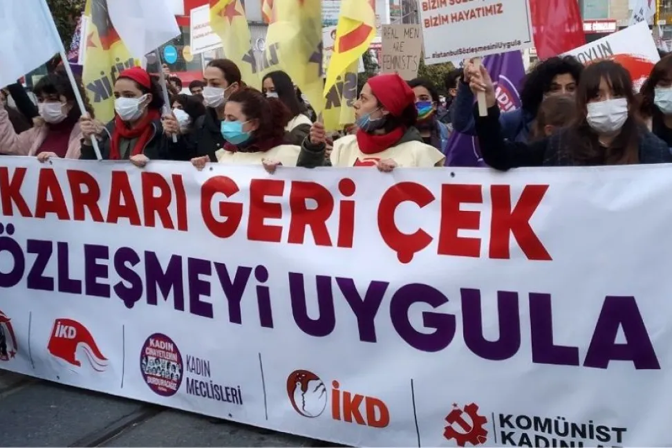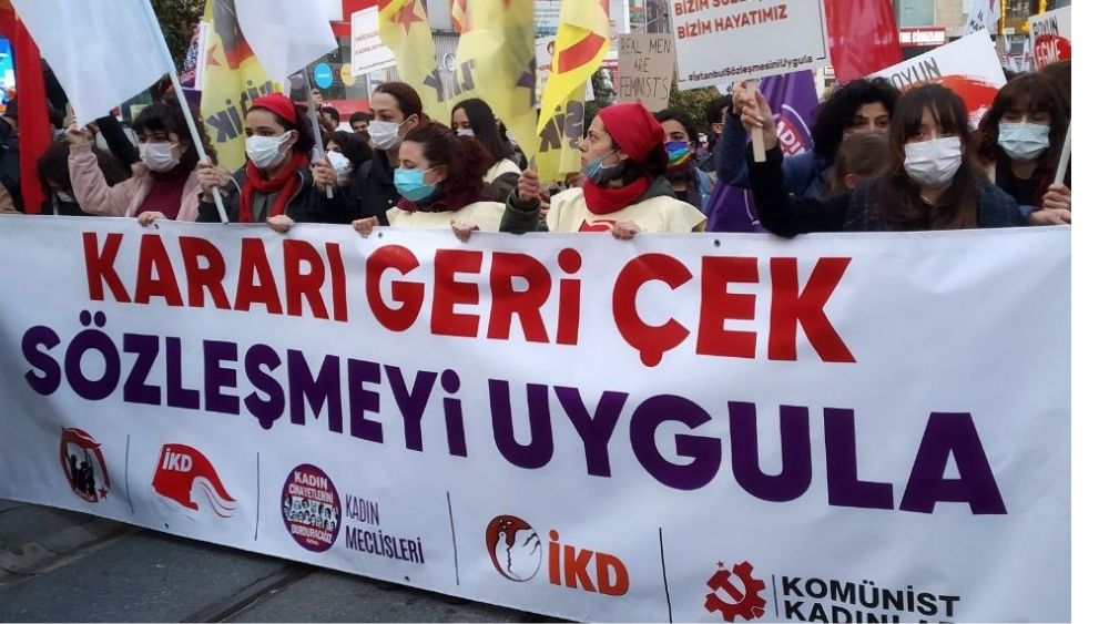 Burada Komünist Kadınlar adına konuşan Eda Nurdar "Dokuz yıl önce AKP'nin puan toplamak için, kadın direnişlerine hesap veremediği için, sorumlusu olduğu binlerce cinayete karşı geri adım atmak zorunda kaldığı için imzaladığı sözleşmeden bugün yine kendisini iktidara getiren bir avuç yobaz için geri çekildiğini biliyoruz. Ne haltlar yedikleri belli olmadığı o arabalardan inmemek için, o koltuklarda biraz daha oturmak için bir avuç yobazı okşamak için milyonlarca kadını hangi şartlar altında bıraktıklarını biliyoruz. Biz biliyoruz: Biz boyun eğmezsek üniversitede gerici hocalara bizi mahkum edemezler, fabrikalarda patron şiddetiyle baş başa bırakamazlar, şiddet gördüğümüz eve bizi geri gönderemezler, sığınalım diye bizi gönderdikleri evlerin adreslerini şiddet gördüğümüz erkeklere veremezler" dedi.