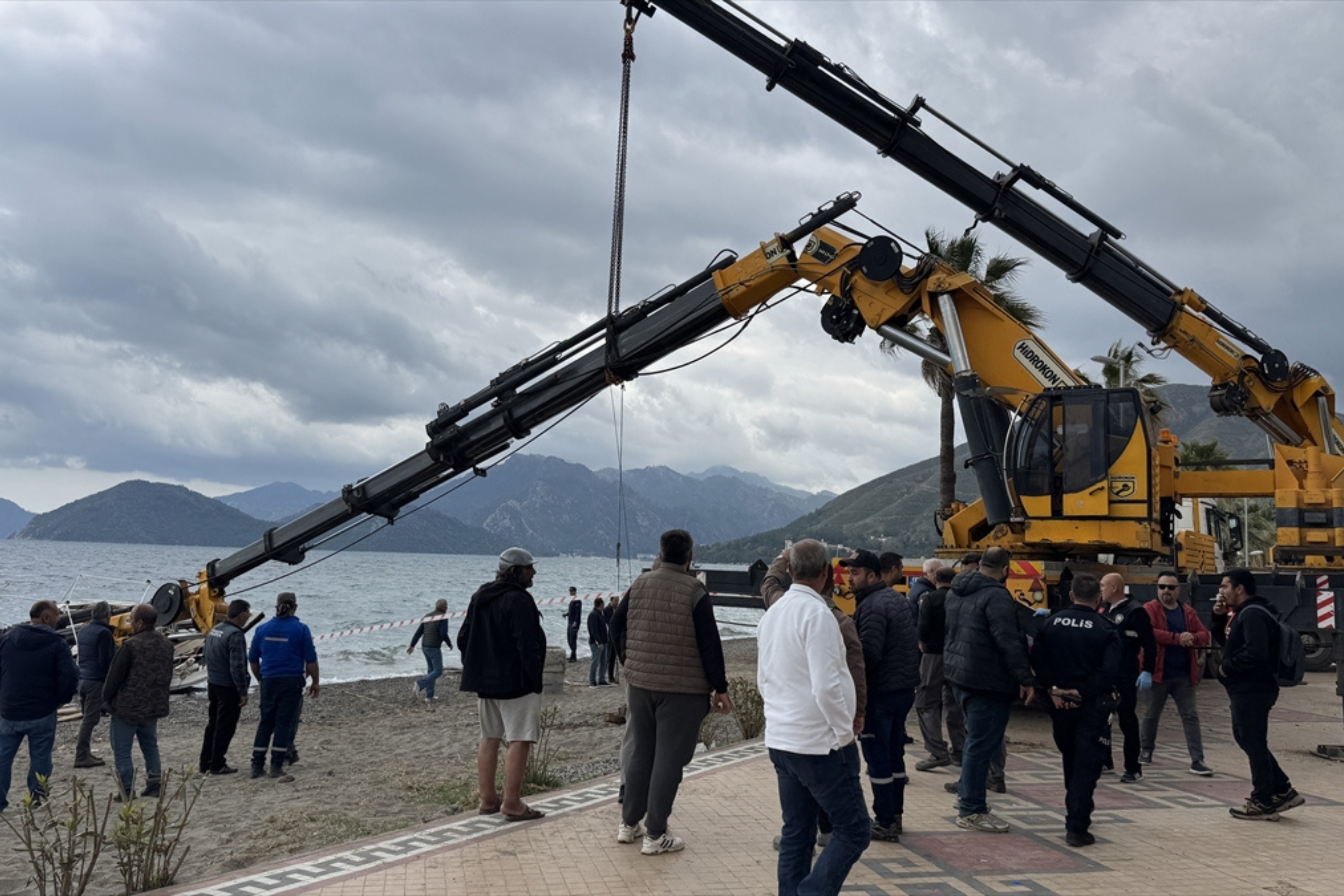 Muğla'nın Marmaris ilçesine bağlı Uzunyalı Mahallesi'nde denizde bulunan bir teknenin motorunun vinç yardımıyla tekneye yüklendiği sırada vincin taşıma kolu kırıldı.