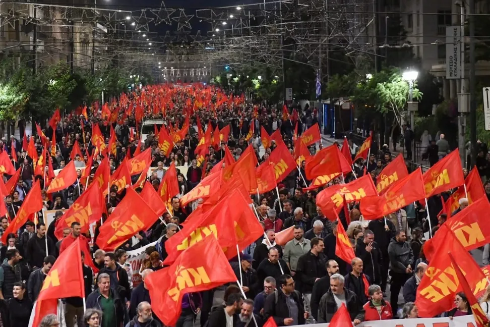 Yunanistan Komünist Partisi'nin (KKE) başını çektiği yürüyüşe öğrencilerin yanı sıra birçok yurttaş, siyasi parti ve işçi örgütü katıldı.