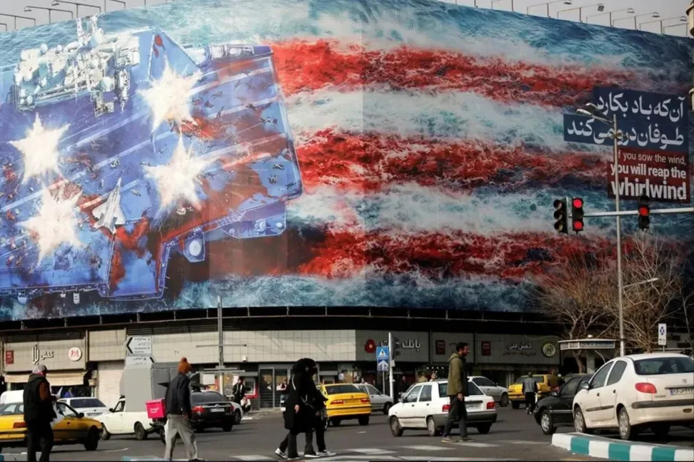 Tahran'da ABD'ye karşı asılan dev pankartta "Rüzgar Eken Fırtına Biçer" yazıyor.